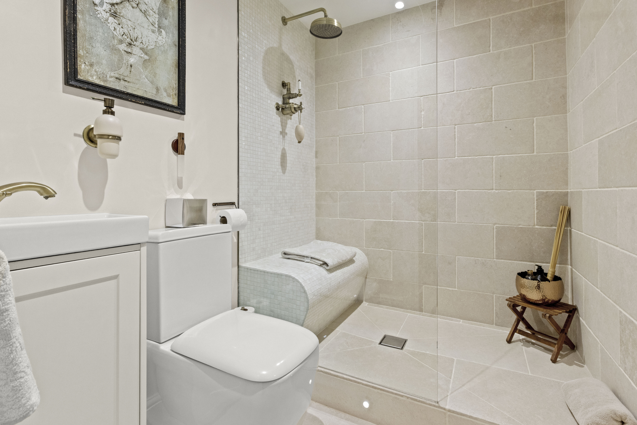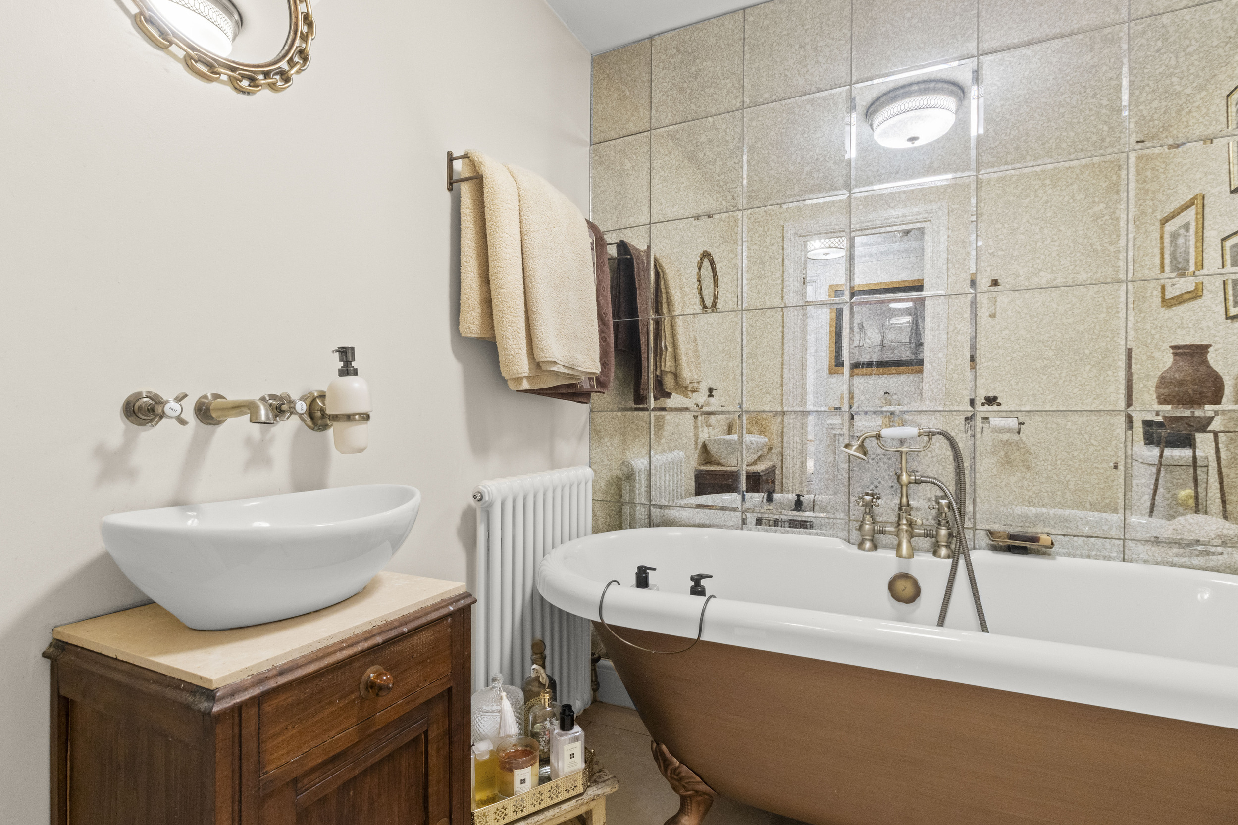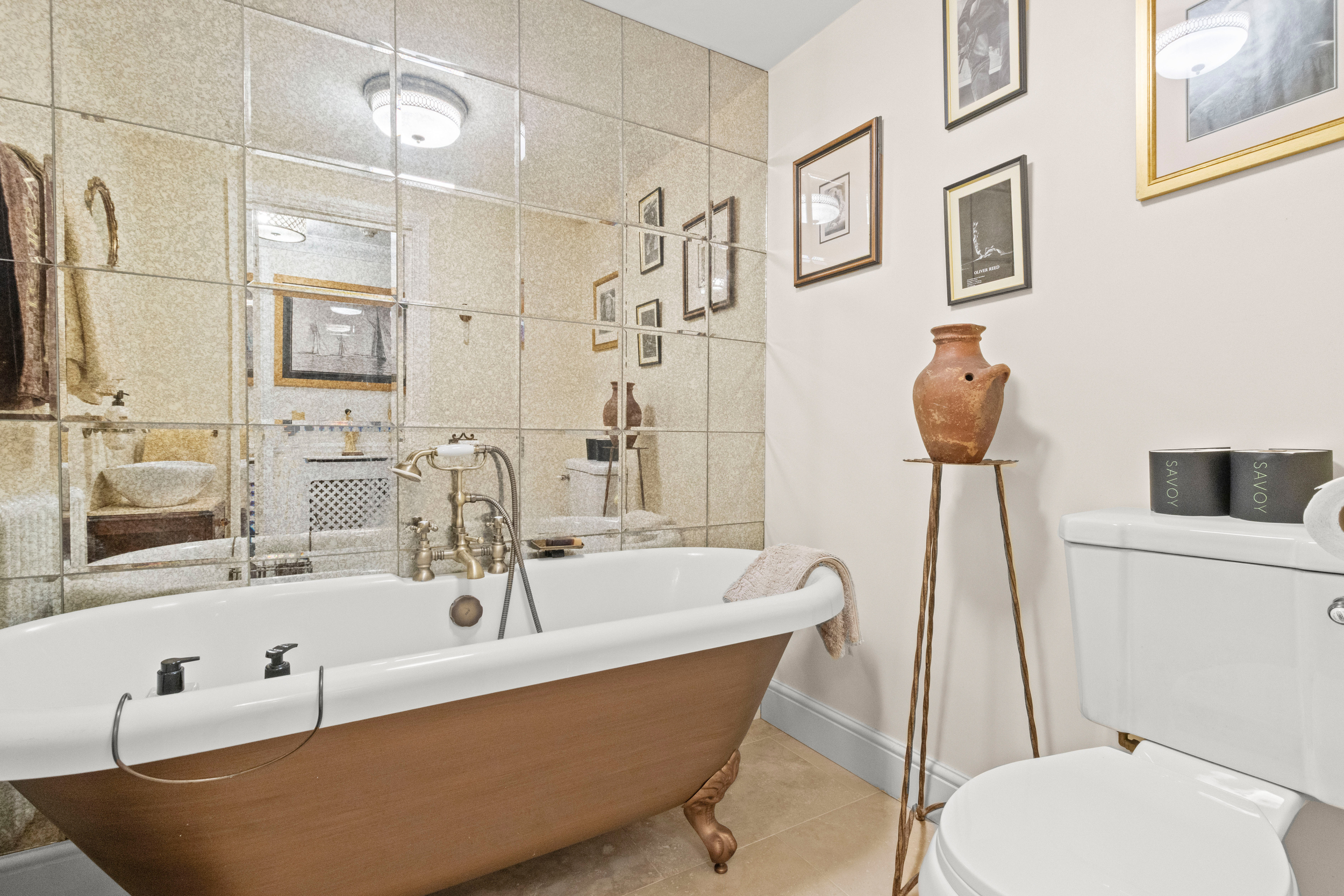 The same meticulous attention to detail continues into the bathrooms. The main bathroom is beautifully appointed with a deep roll-top bronze bath, coordinating bronze fixtures, WC, countertop basin and striking antique mirrored wall, creating an elegant and luxurious setting.