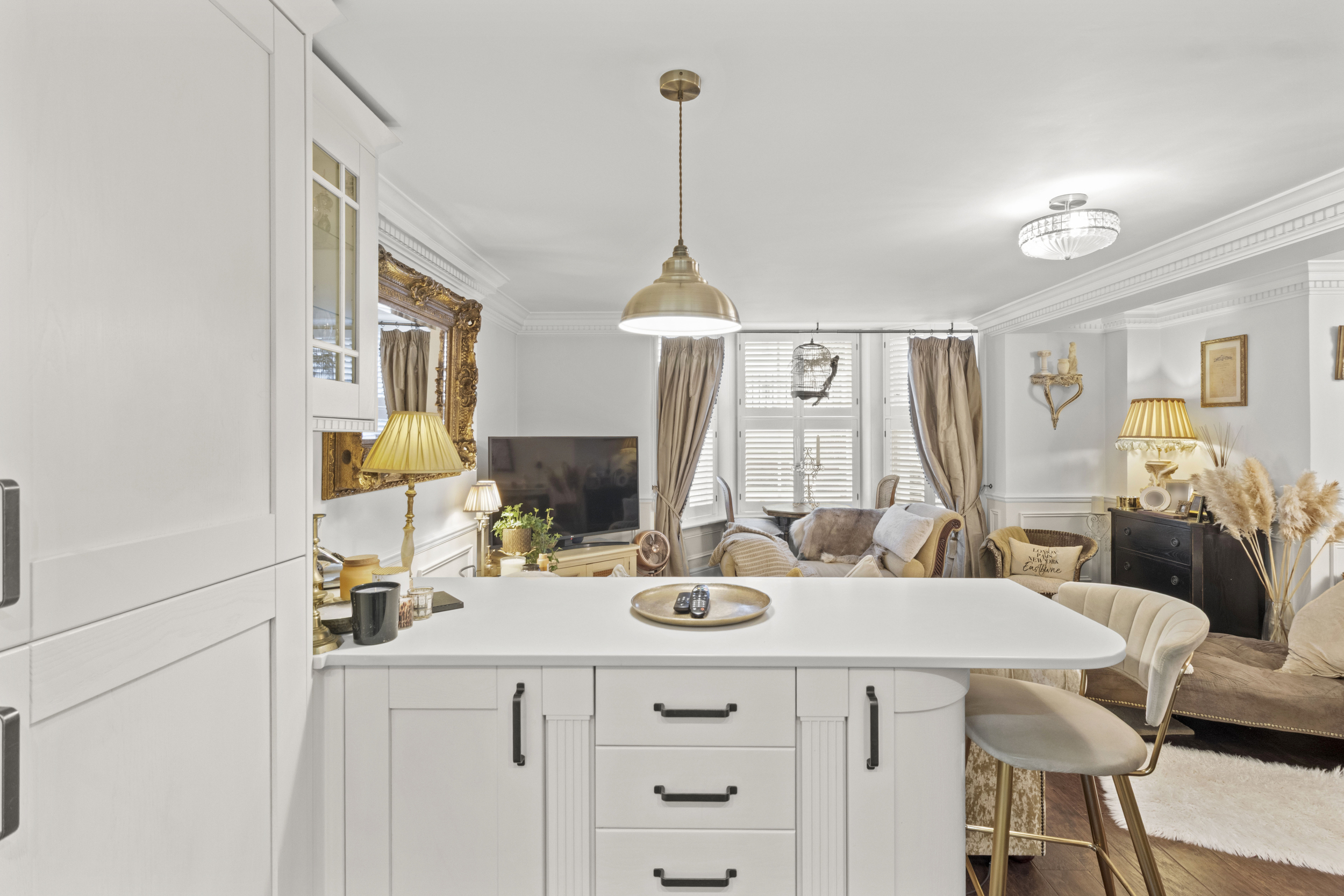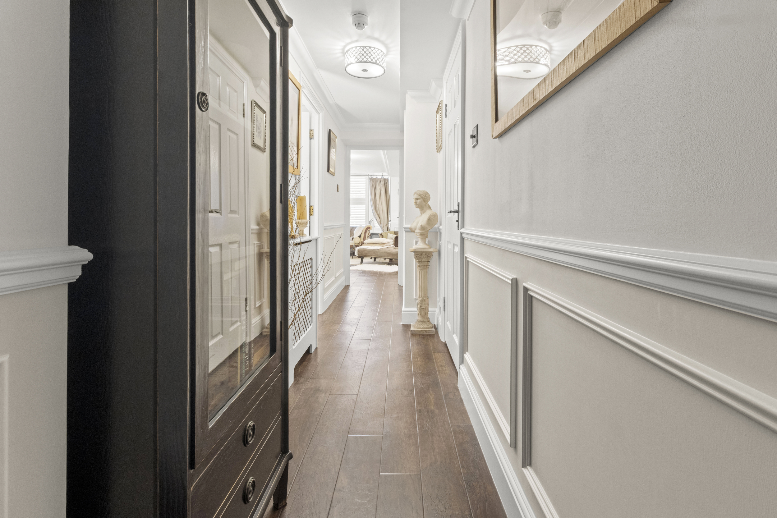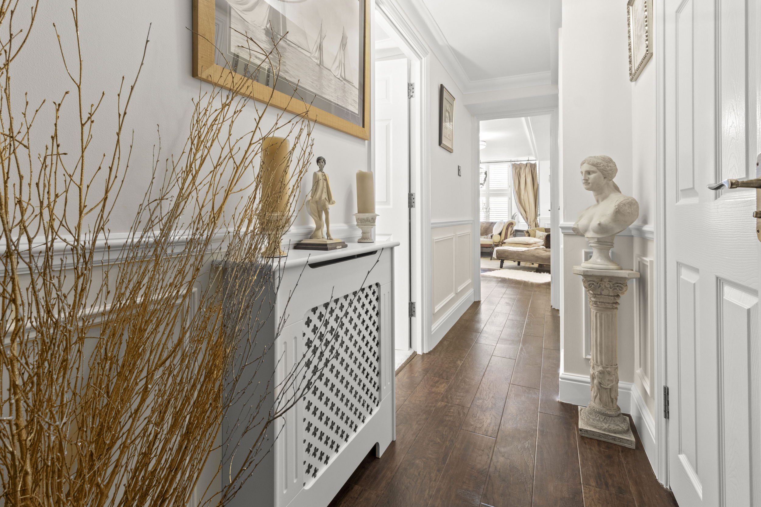 From the reception room, an inner hallway leads to the remaining accommodation. The professionally panelled walls in the living room continue seamlessly into the hallway, creating a cohesive and sophisticated aesthetic throughout. A series of thoughtfully designed storage cupboards ensures the apartment remains clutter-free, enhancing the clean, elegant, and considered interior design.