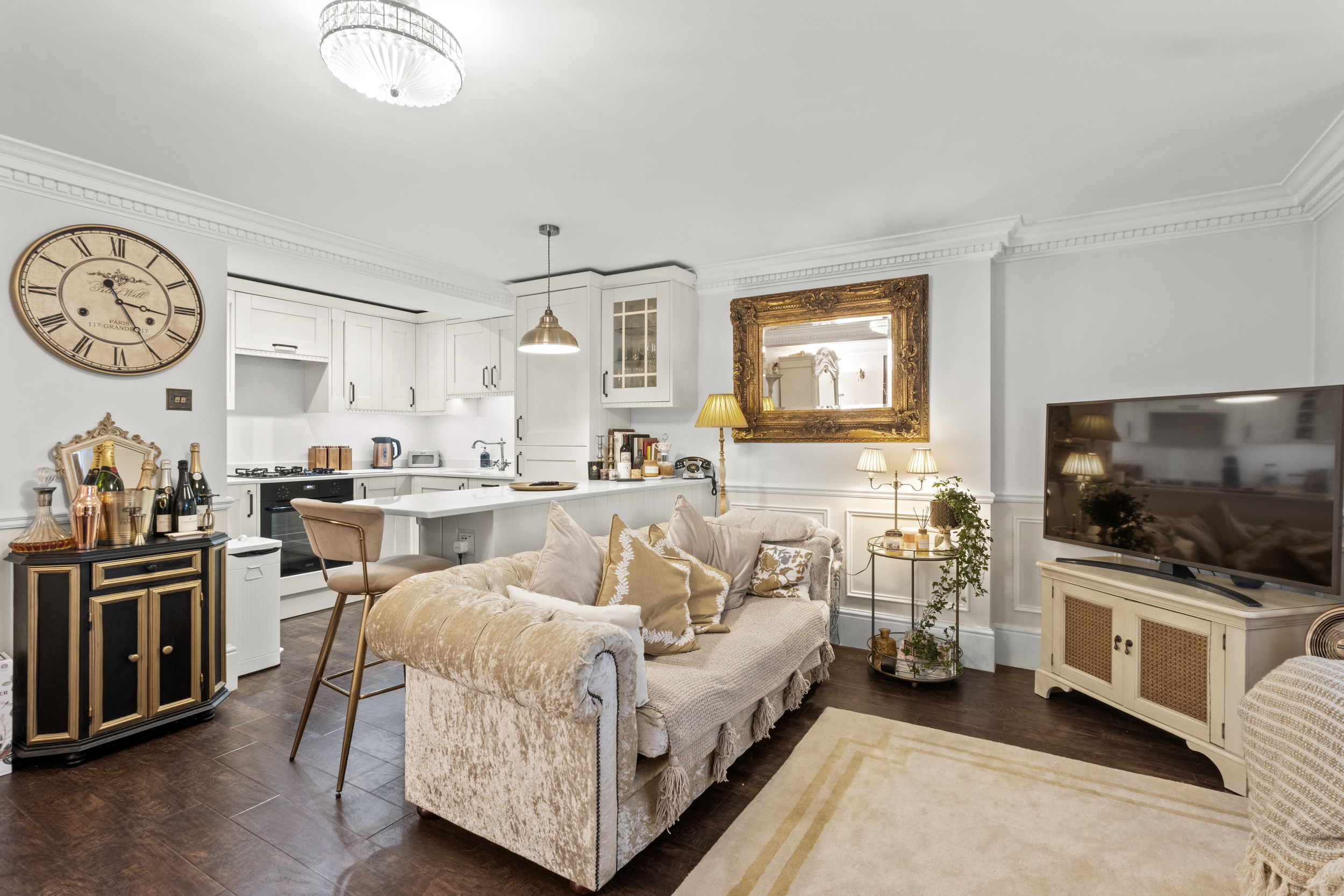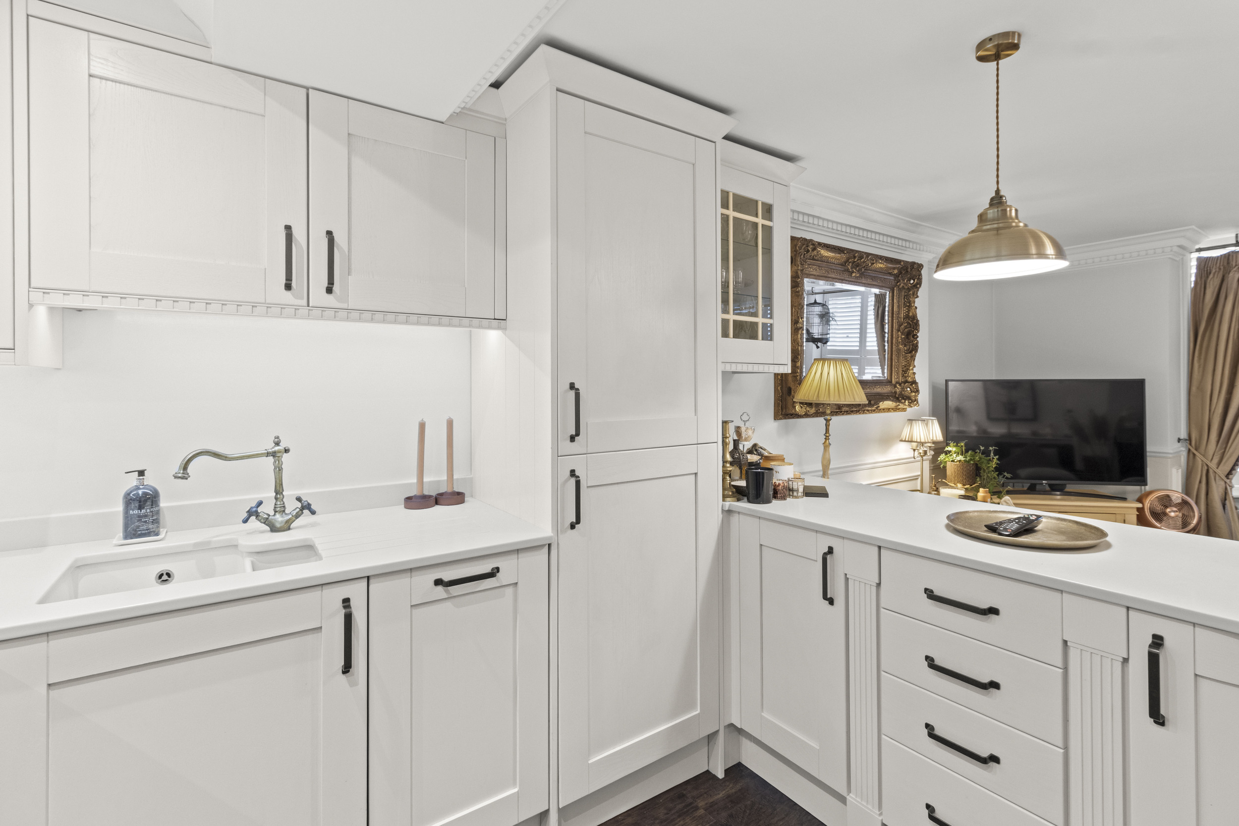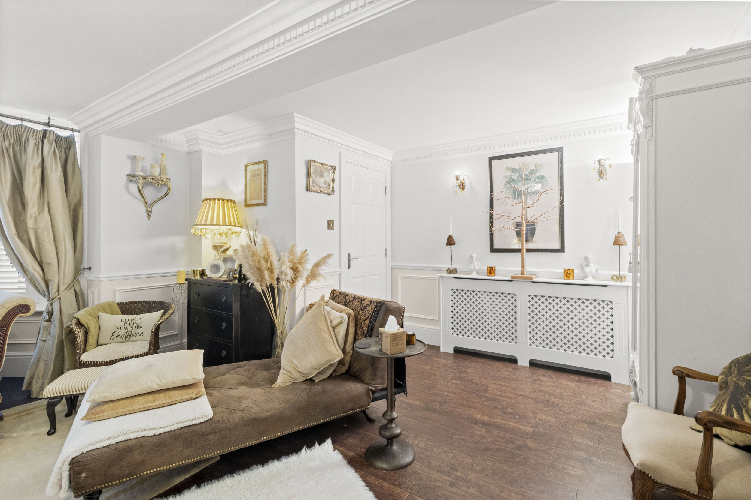 From the reception room, an inner hallway leads to the remaining accommodation. The professionally panelled walls in the living room continue seamlessly into the hallway, creating a cohesive and sophisticated aesthetic throughout. A series of thoughtfully designed storage cupboards ensures the apartment remains clutter-free, enhancing the clean, elegant, and considered interior design.