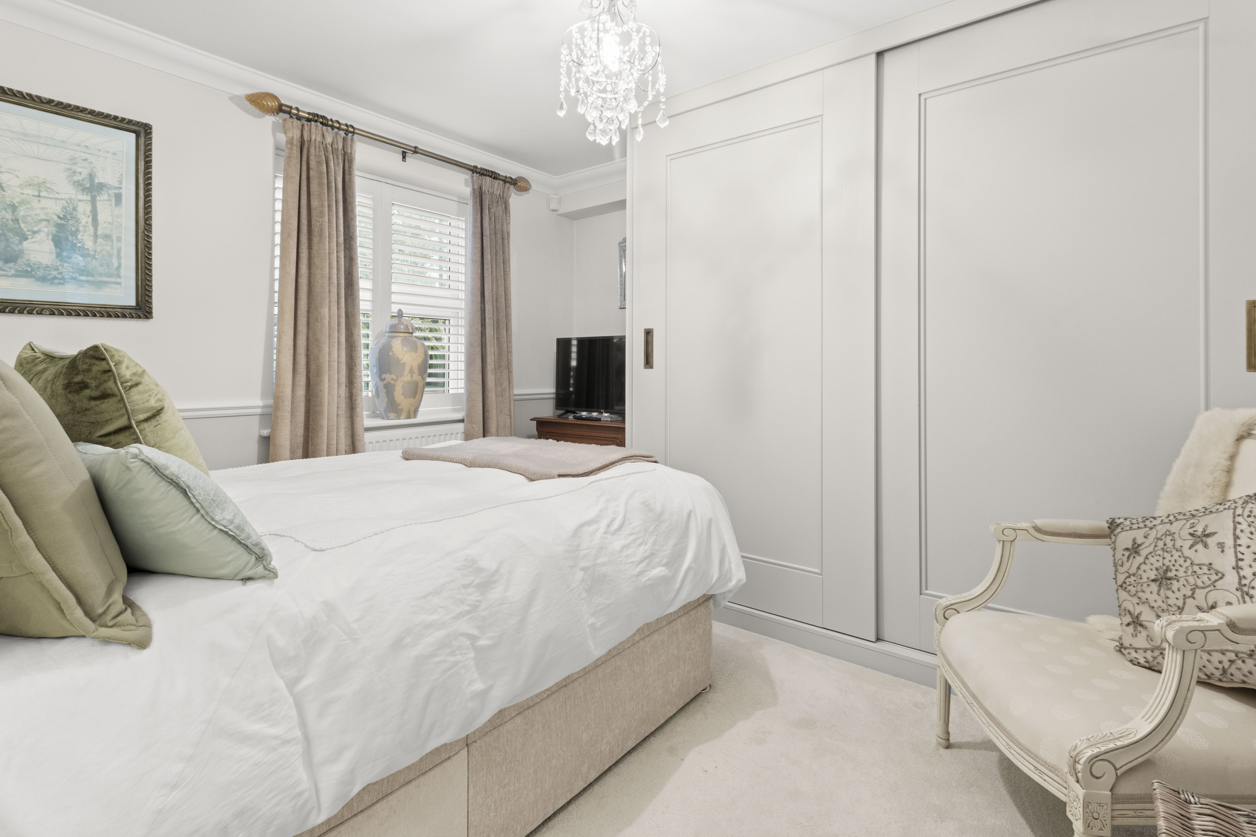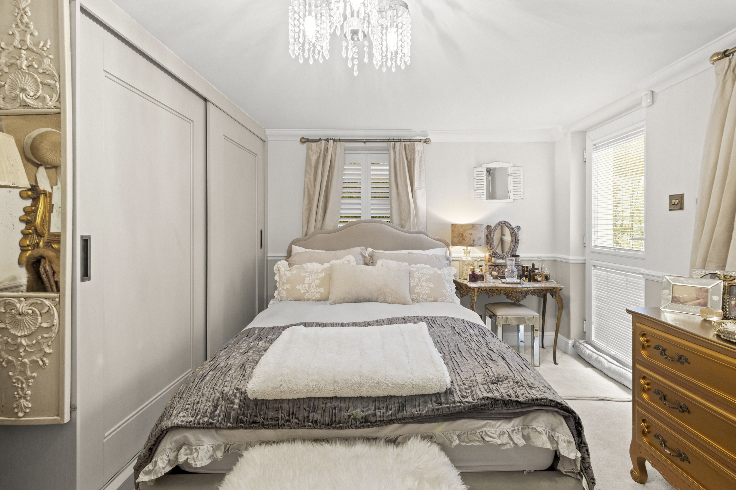 The apartment offers two generously sized double bedrooms, both finished to an exceptional standard with high-quality fixtures and fittings throughout. Bedroom two benefits from brand new carpeting, while both rooms feature bespoke Hammonds custom-fitted wardrobes with full carcass construction and soft-close doors, providing stylish and practical storage solutions. Each bedroom enjoys a pleasant outlook over the rear garden, with the principal suite further enhanced by its own private access to the outside space.
