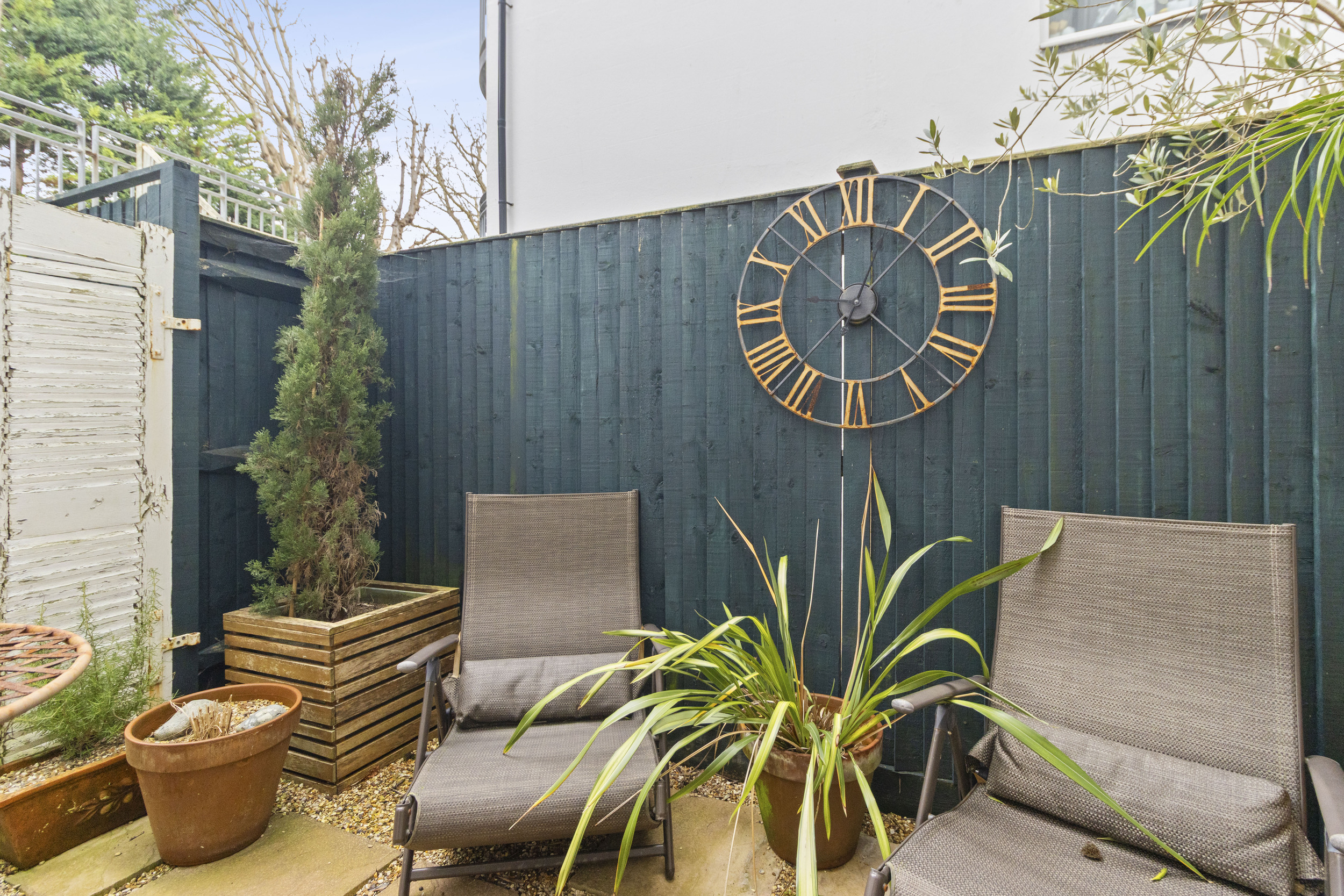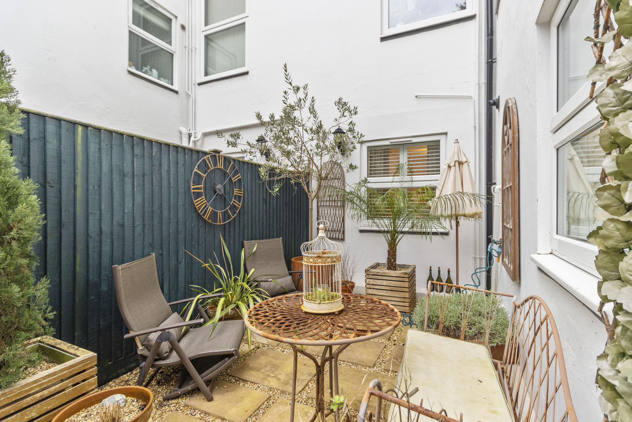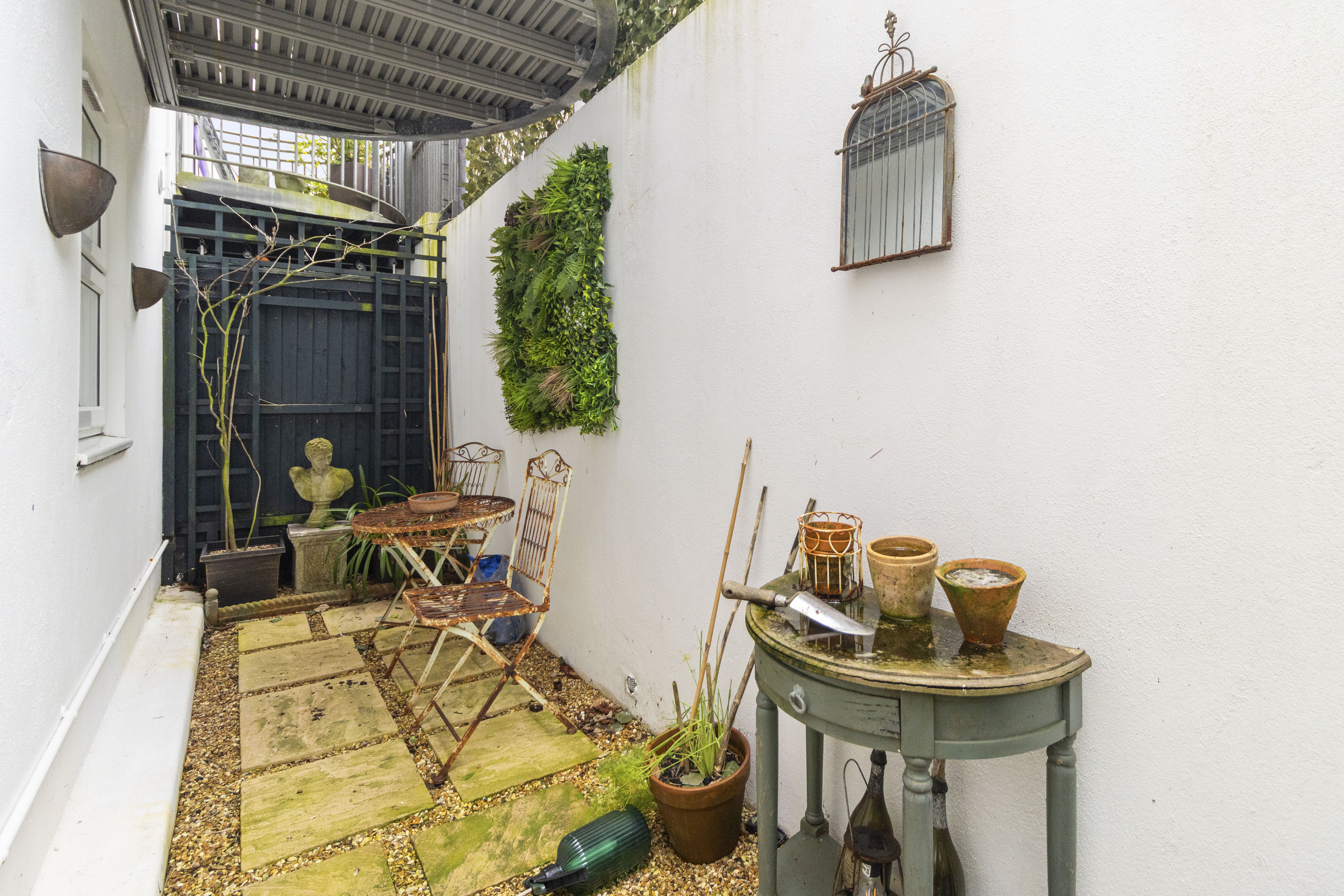 The courtyard is thoughtfully landscaped with a mix of pea shingle and terracotta stones, accentuated by traditional Victorian-style edging, combining classic elegance with a relaxed, Mediterranean feel. The layout incorporates two separate seating areas, ideal for flexible use — one perfect for a leisurely morning coffee and the other for enjoying a glass of wine in the evening sun.