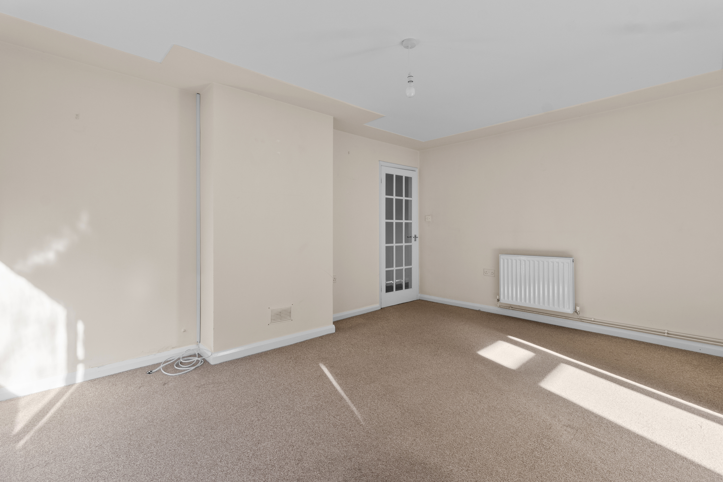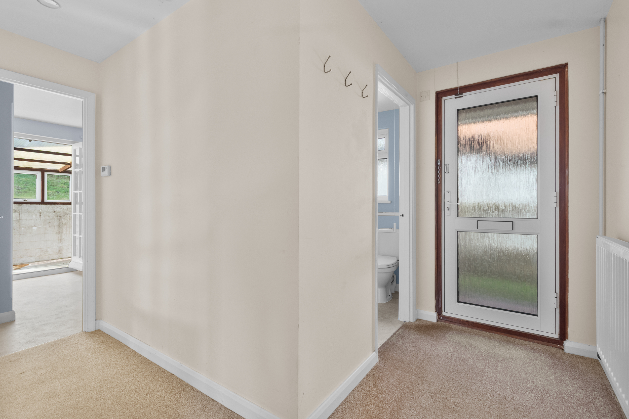 Upon entering, you are welcomed into an L-shaped entrance hall, which immediately provides a sense of space and flow. The hall serves as the central hub of the bungalow, giving access to all principal rooms and allowing for flexible use, including potential storage or display areas. Its layout ensures a smooth transition between living spaces while maintaining privacy for the bedrooms.