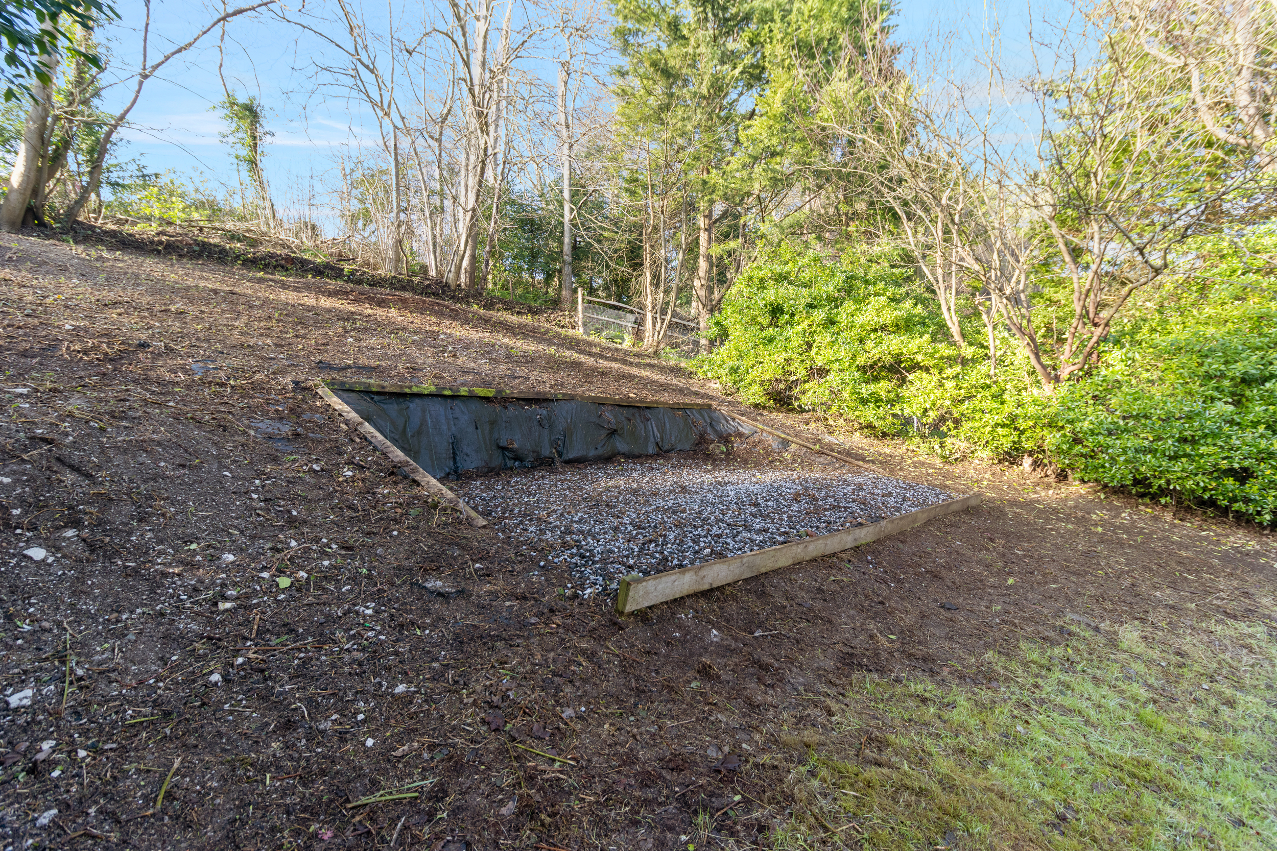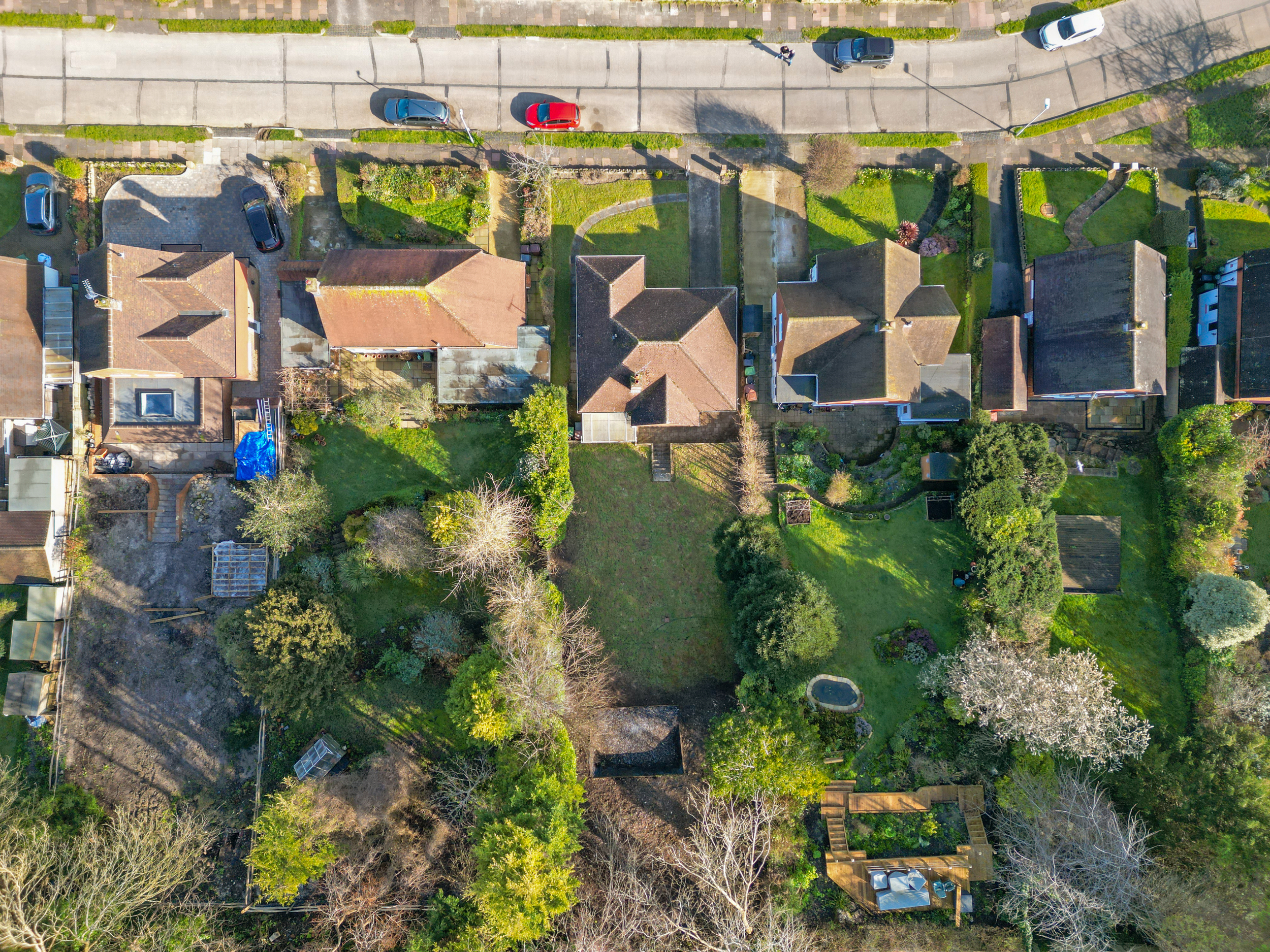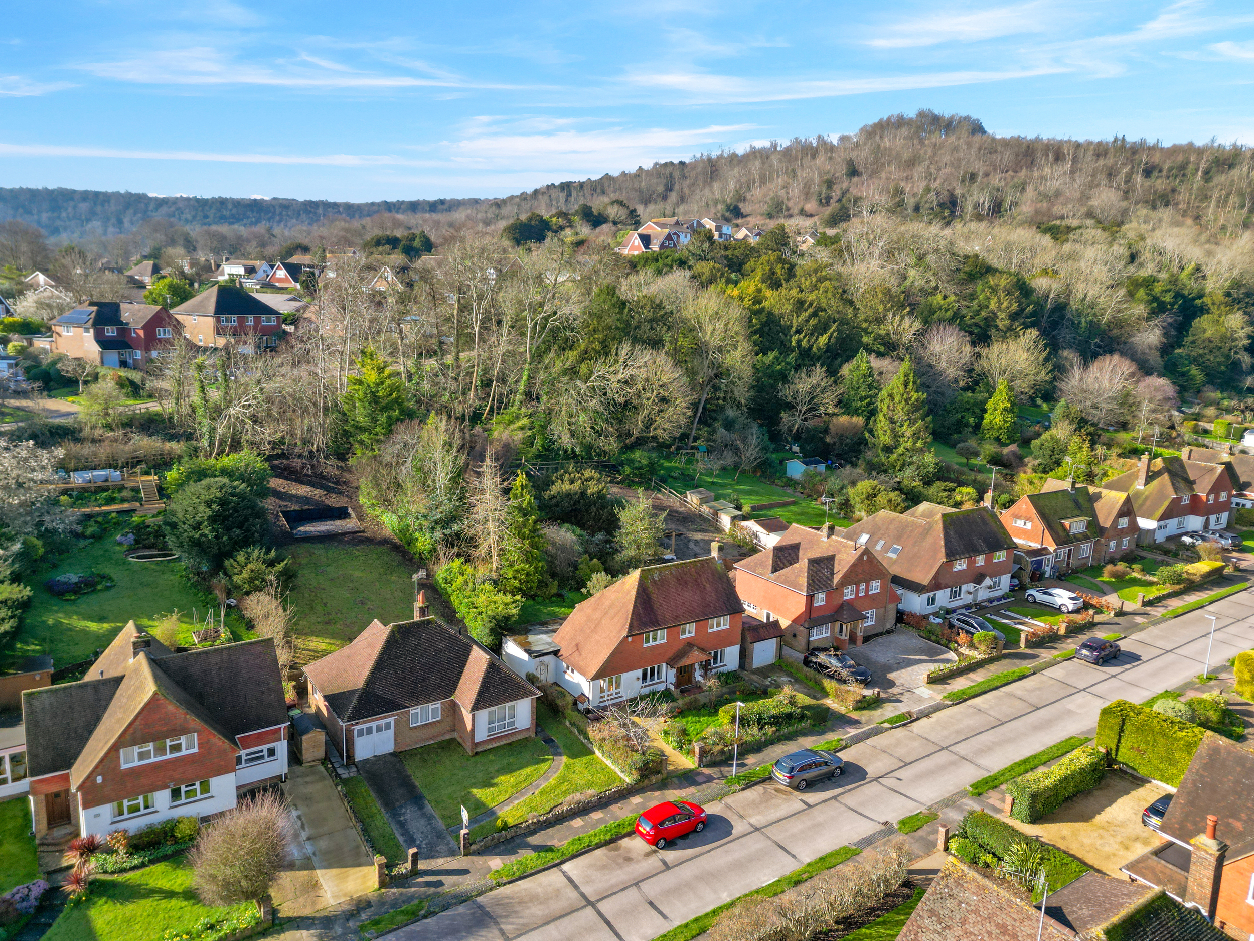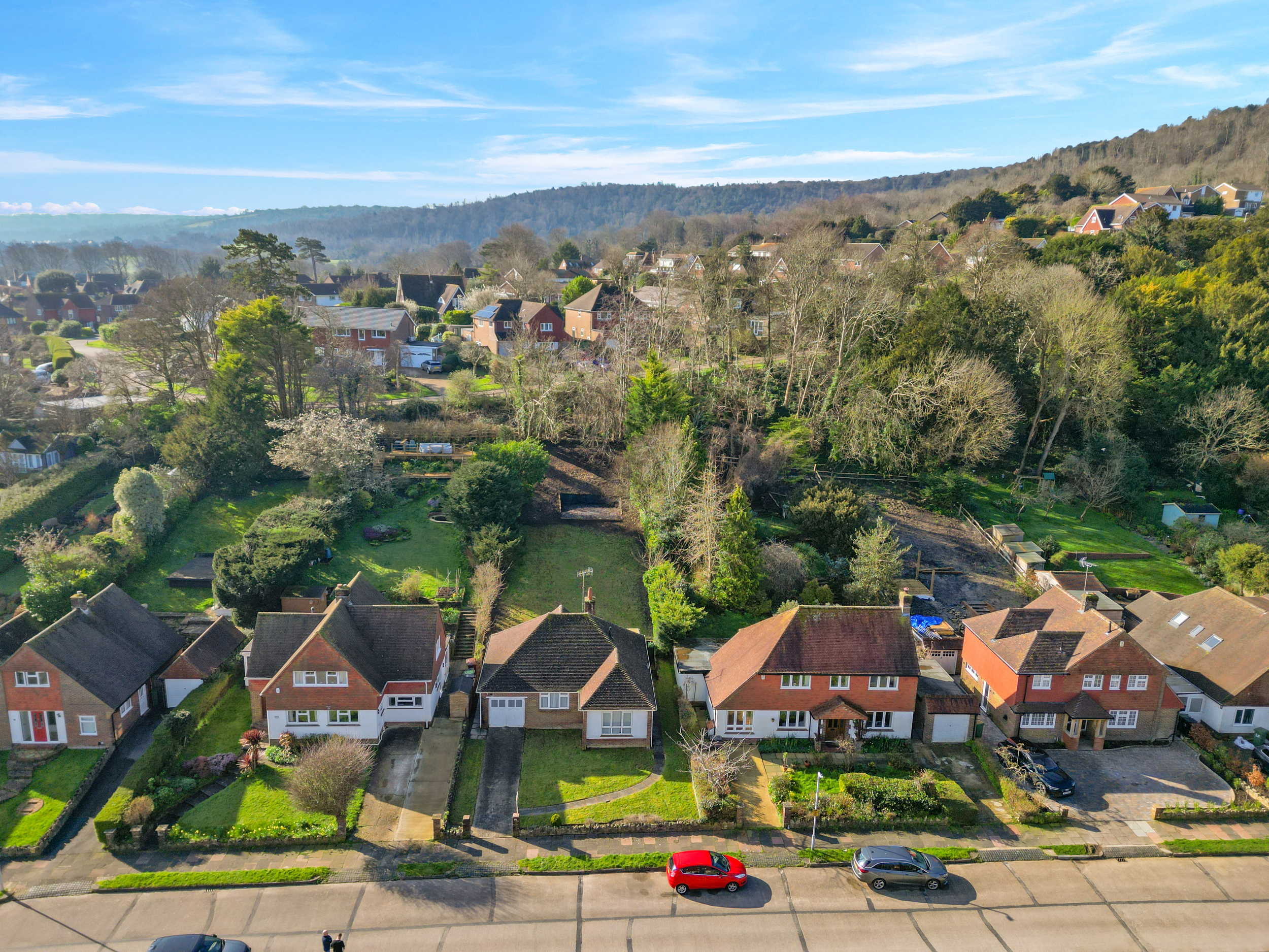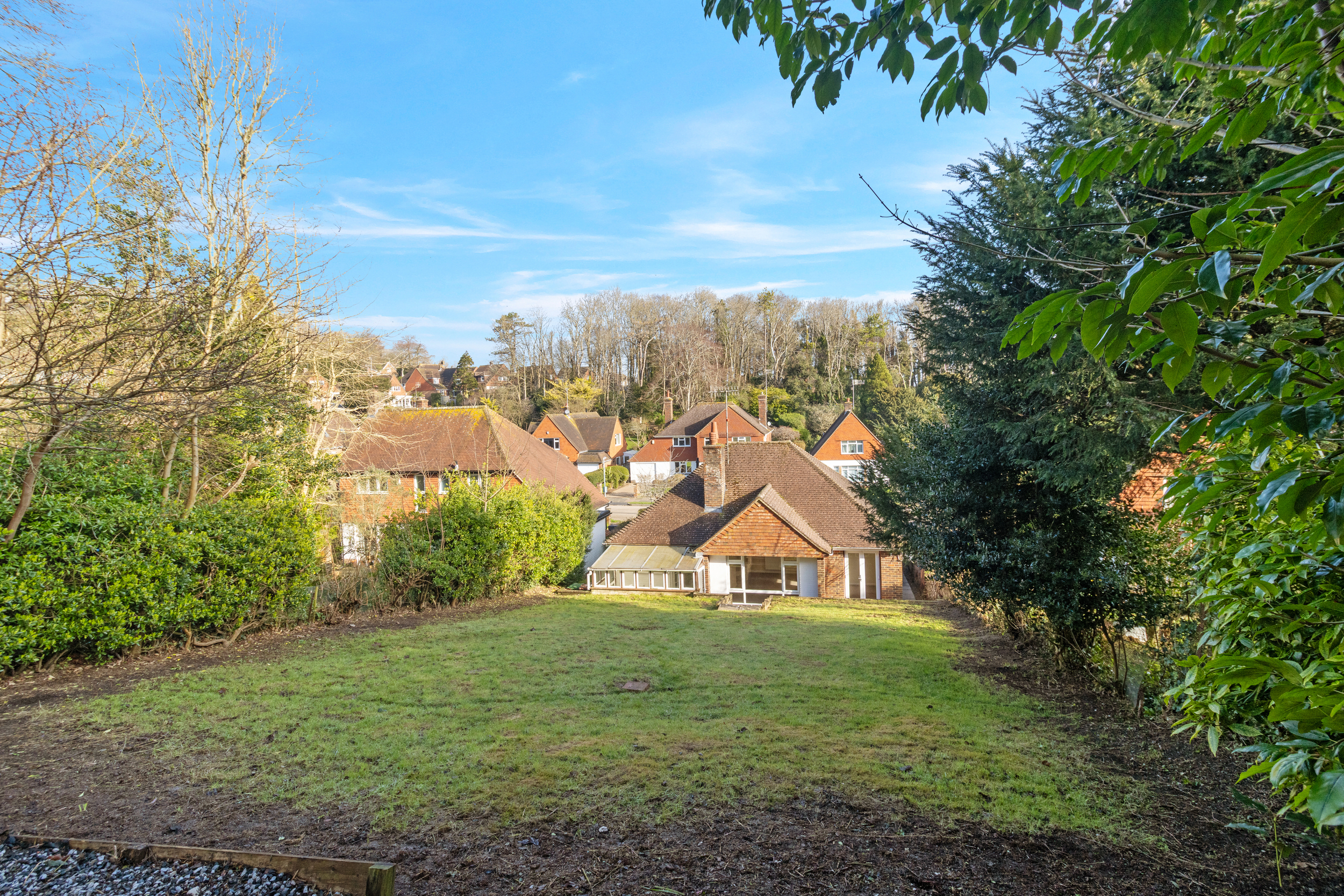 Externally, the property features a driveway providing off-road parking leading to the garage, along with a front lawn and sweeping pathway to the entrance and side. The rear garden is a particular highlight and provides a substantial and versatile space for outdoor living. A small patio area adjoins the property and opens onto an expansive lawn, bordered by a selection of mature trees. The garden slopes gently and presents a blank canvas for landscaping, with neighbouring properties having enhanced their plots with tiered gardens and raised decking areas to maximize the outlook.