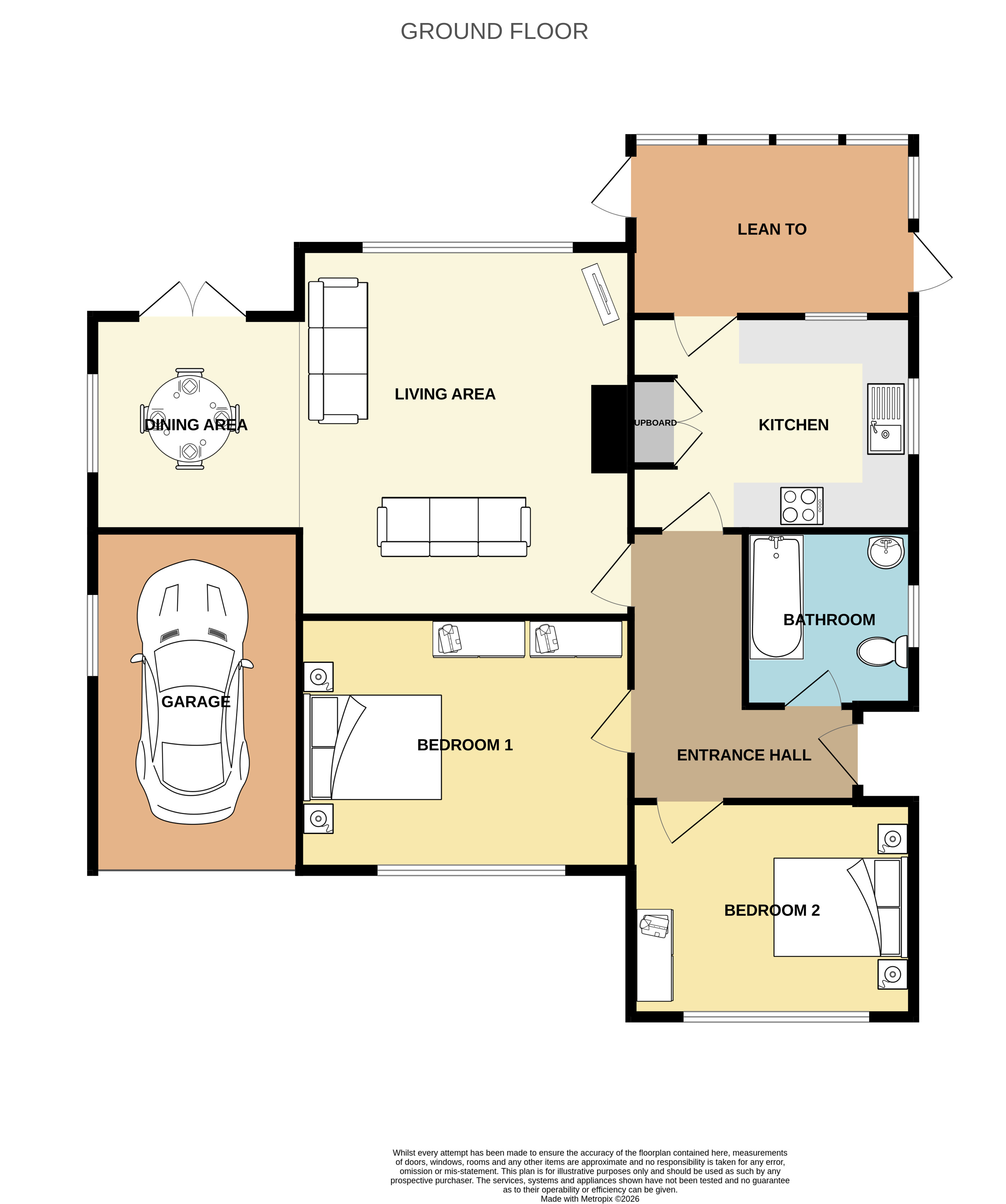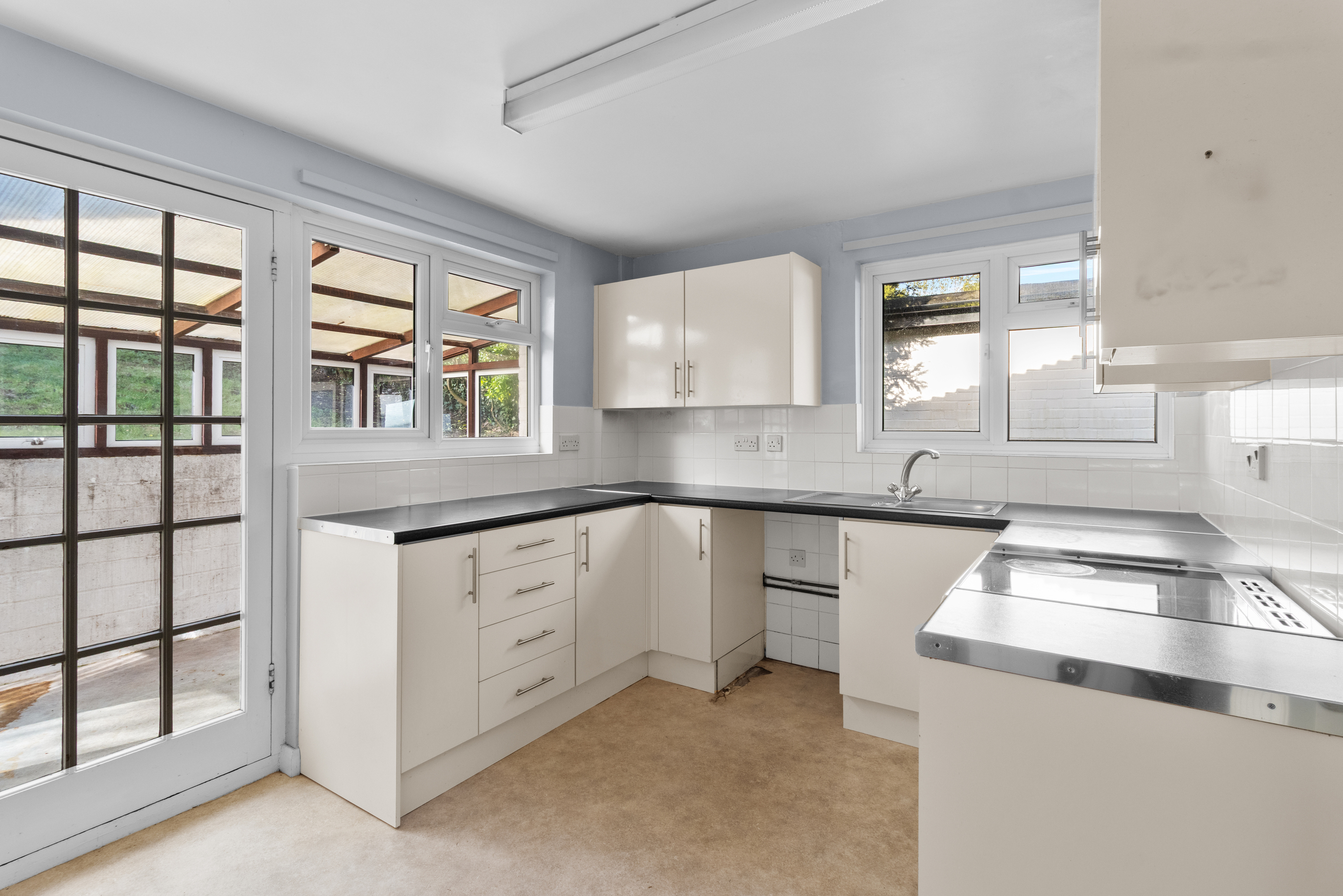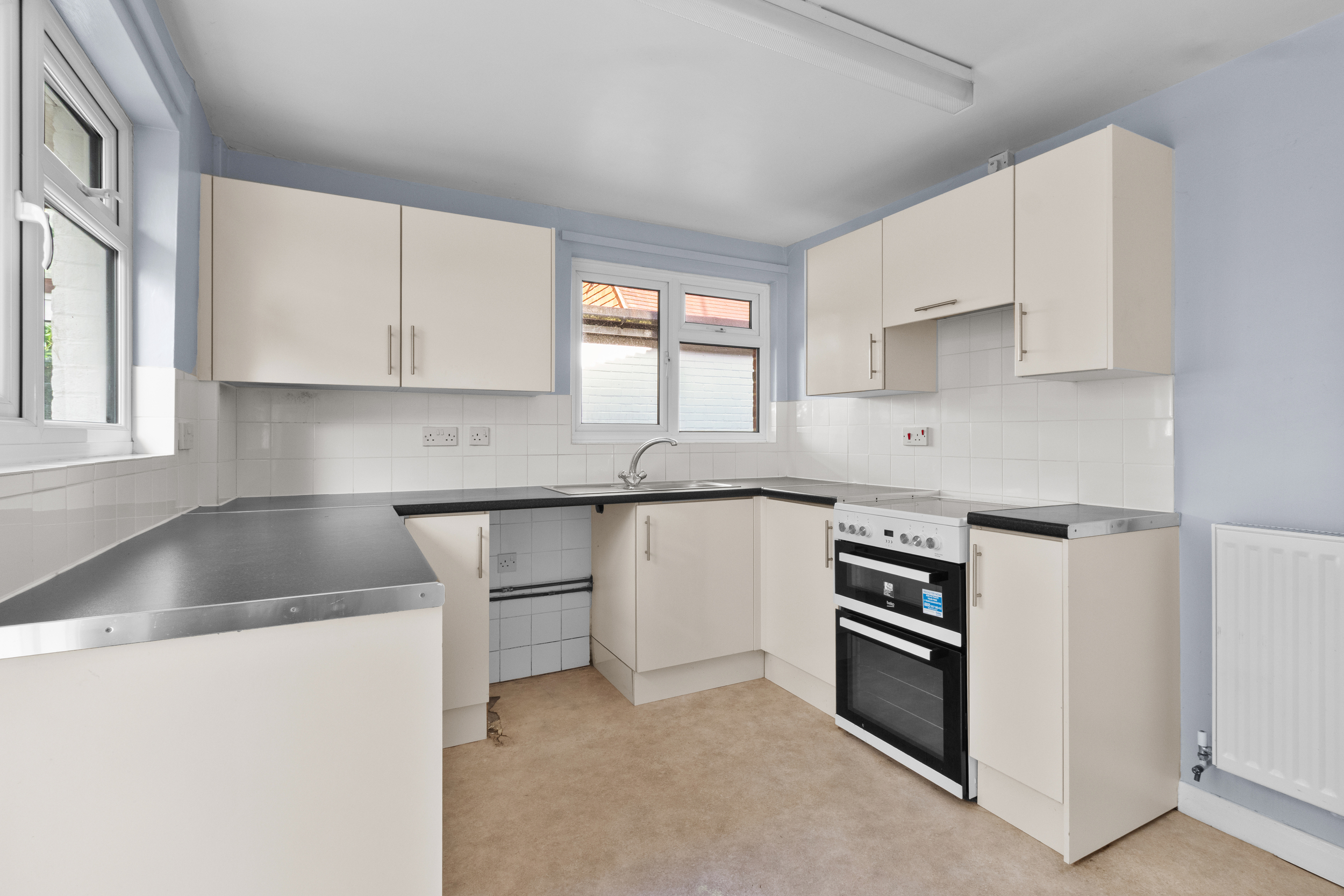 The kitchen is positioned to the rear and is fitted with a comprehensive range of wall-mounted and base units, complemented by work surfaces that provide practical preparation space. There are allocated spaces for freestanding appliances, allowing buyers to tailor the kitchen to their needs. With a double aspect providing natural light from the side and rear, the kitchen feels open and welcoming, while a door leads directly to the lean-to, perfect for utility purposes or extra storage.