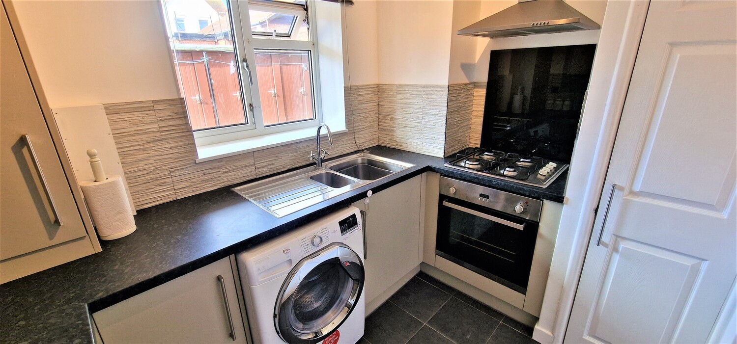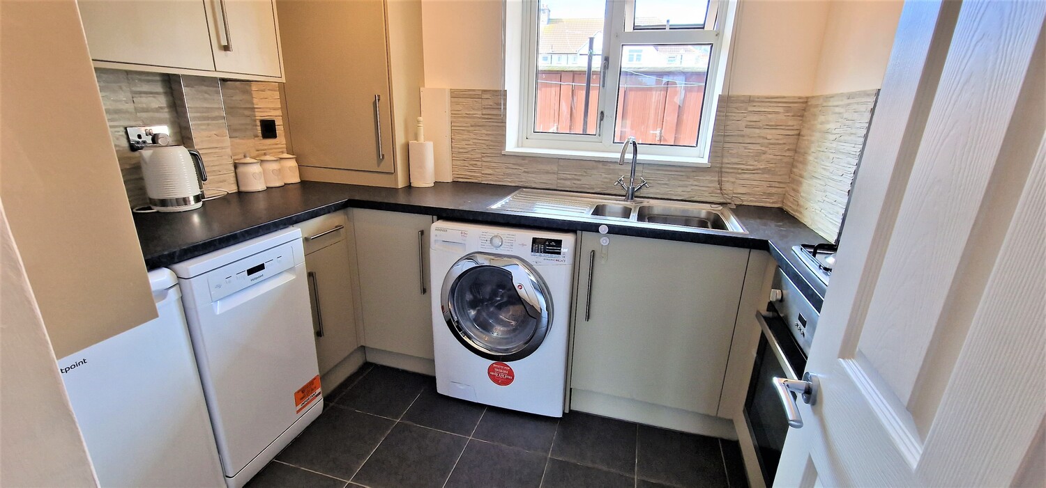 The modern fitted kitchen is equipped with a range of wall mounted and matching base units with work surface over. There is a one and a half bowl stainless steel single drainer sink unit with mixer taps, built in electric oven with four ring gas hob with extractor hood over, space and plumbing for washing machine and dishwasher and space for under counter fridge. There is a built in storage cupboard and a double glazed window to the rear.